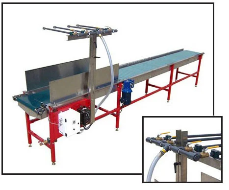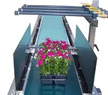 The 14 Foot Water Tunnel provides controlled watering for flats, trays, pots, and baskets—with extended dwell time for heavier irrigation needs. Available in 16″ and 22″ widths as either 14-foot powered conveyor or 7-foot powered plus 7-foot gravity roller. Standard variable speed up to 80 ft/min, 4-bar manifold, and drain pans. Wires into line controls—watering stops/starts with production to prevent over/under-watering. Accommodates containers up to 31.5″ tall including hanging baskets.