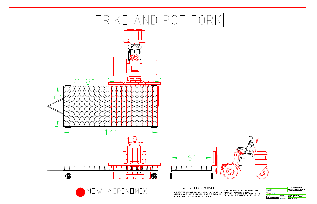 AdeptAg Pot Forks dramatically reduce labor for moving plants around the greenhouse/nursery. Move hundreds of pots at once; load/unload carts/wagons or set down in the growing area. Custom-designed based on pots, wagon size, and spacing. Rugged mast handles lifts over 2000 lbs. Adjustable tine brackets with laser-cut Y-shaped serrated edges secure pots. 2-part pressed tine design provides strength and aligns pots on pickup. Compatible with Prins Trike, Electro, Boxer, and traditional forklifts.