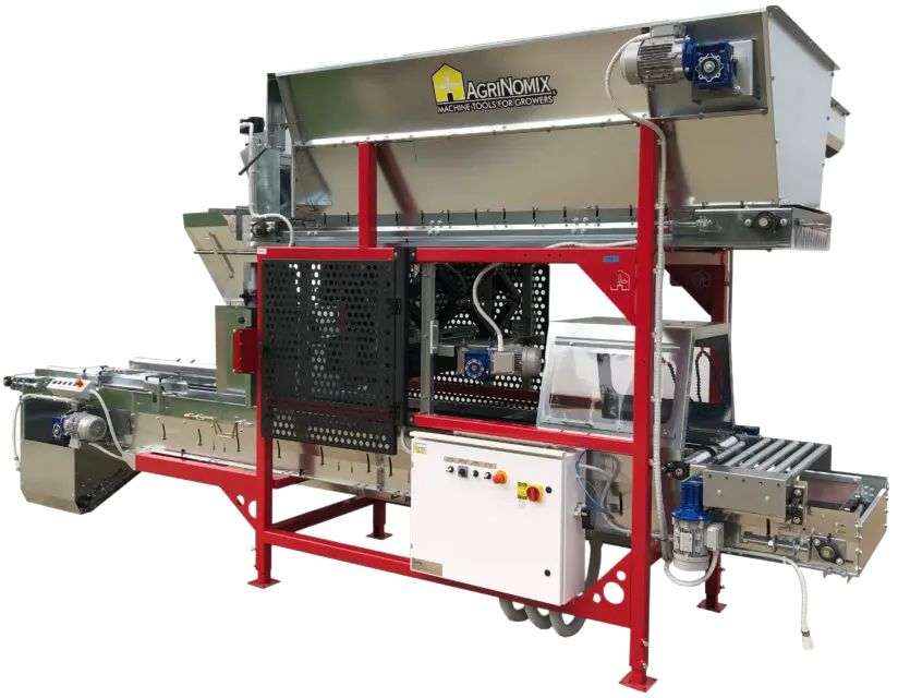 The KV-XM features a 31.5″-wide heavy-duty double galvanized elevator chain delivering up to .5 yards of soil per minute. Fill trays and pots up to 17.75″ tall quickly and uniformly. Soil density and compaction are precisely controlled by a 4-blade longitudinal rotor, powered roller, leveling auger, and finishing brush—all quickly adjusted with crank handles for fast changeovers. Powered outfeed rollers and conveyor belt efficiently return excess soil to circulation, reducing waste.