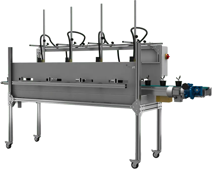 Automate watering for both round and square pots as they move along a conveyor belt. Integrated photoelectric sensors precisely detect each pot, allowing adjustable nozzles to deliver the exact amount of water needed. Touchscreen control provides individual water adjustment for precise irrigation—ensuring optimal water for each plant while minimizing waste. Stainless steel contact surfaces and removable side panels simplify cleaning. Easily integrates into potting machine production lines.
