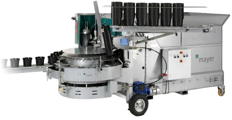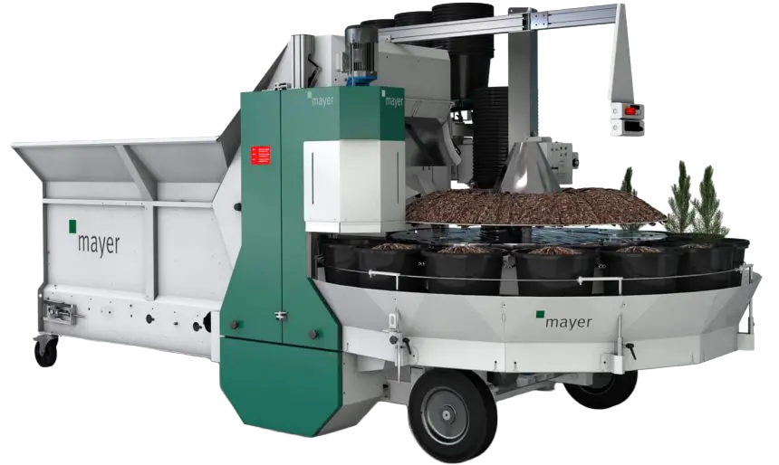 The Mayer TM-2020F Potting Machine is specially designed for tree nurseries. In addition to an extremely robust and durable design, the TM 2020F; like all of our machines, is characterized by very smooth running and simple handling. The TM 2020F can accommodate both round pots from 12 to 40 cm, as well as square pots from 9 to 25 cm. The soil hopper has a capacity of up to 5000 liters and allows processing without tunneling.